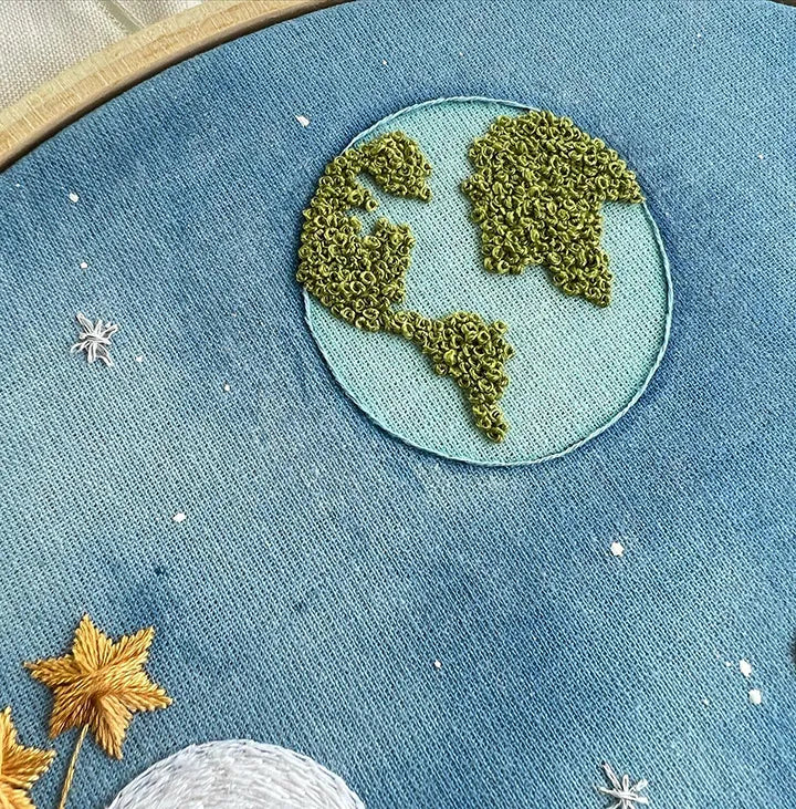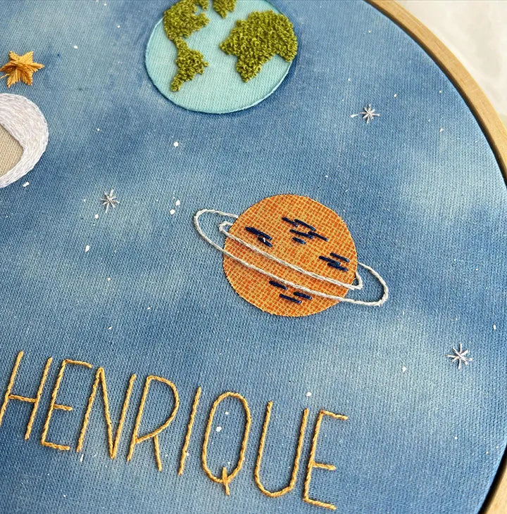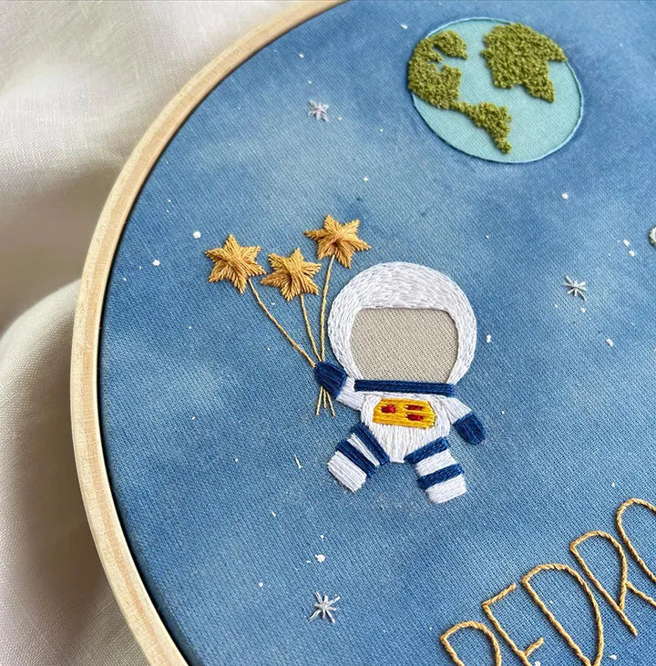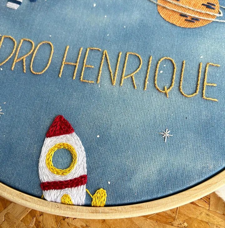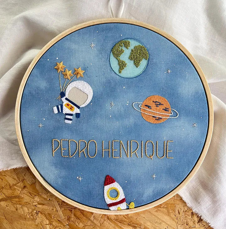Adventure space ago clock begins with premium Korean fabric. We sketch each delicate design and text. Then we add gentle watercolor touches for that dreamy feel. Using fine French threads, we hand stitch every detail. Each detail gets individual attention. Your child's name is stitched by hand with love. It becomes part of this story clock. The finished space clock is protected by clear glass that keeps colors looking fresh.
